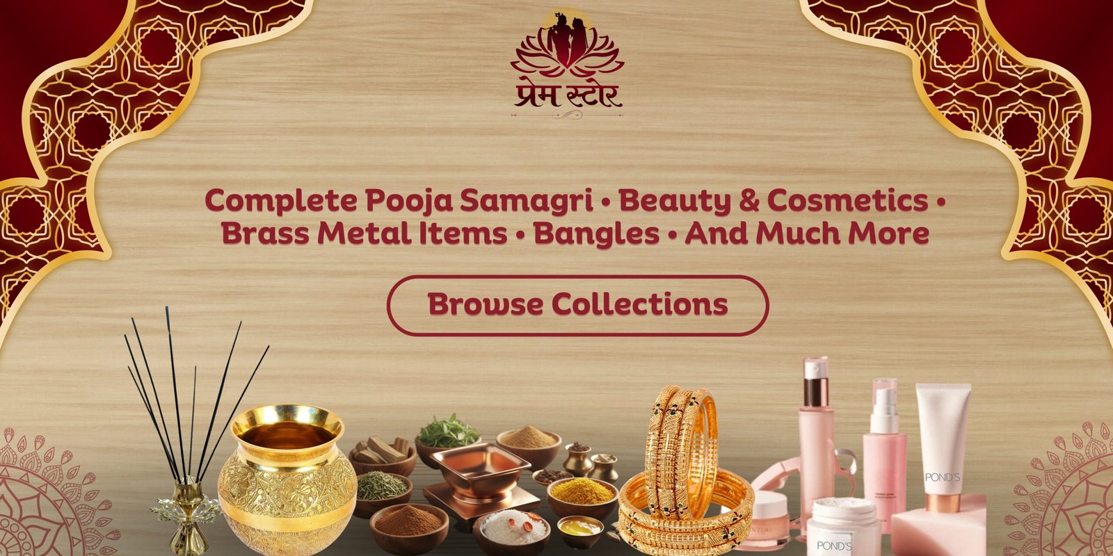 Discover complete pooja samagri at Prem Store. From agarbatti and camphor to brass diyas and sacred idols, find all your religious essentials in one place. Pure, authentic, and perfect for your daily prayers and special occasions.