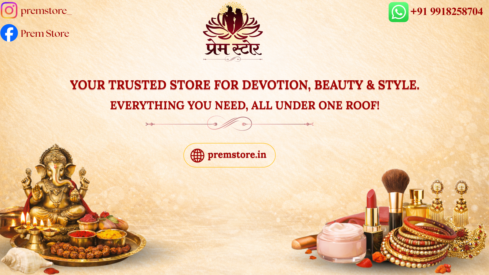 From traditional incense and diyas to complete pooja thalis and sacred idols, we offer premium quality products that honor your faith and traditions. Every item in our pooja collection is carefully selected to ensure purity and authenticity, making your spiritual journey more meaningful. Whether you’re preparing for daily aarti, festive celebrations, or special religious occasions, Prem Store is your trusted partner in devotion.